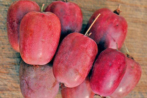 Кожица плодов пурпурного окраса, тонкая и кисловатая. Мякоть имеет фиолетово-алый окрас и отличные вкусовые характеристики. Сладкие плоды в длину вырастают до 4-х см, их собирают в первой декаде октября. Порадовать урожаем растение сможет уже через 3-4 года после посадки