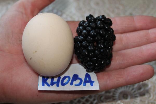 Ежевика Киова Ягоды крупнейших размеров, насыщенно-чёрного оттенка с типичным ежевичным глянцем. Средняя масса одного плода колеблется у отметки в 25 граммов, а рекордсмены достигают и 35 граммов. Форма ягоды коническая, несколько округлая. Киова по вкусу сбалансирована между сладостью и кислотой, имеет плотную и сочную структуру. Семянки средних размеров. Аромат глубокий и имеет нотки лесных ягод. Урожайность Киова на высоком уровне